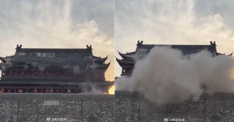 20일 중국 현지매체 등에 따르면, 전날 오후 6시30분쯤 안후이성 츠저우시 펑양현에 위치한 ‘명중도 고루’에서 기와 일부가 떨어지는 사고가 발생했다.