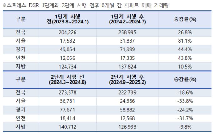 스트레스 DSR 2단계 시행 전(2024년 3~8월), 시행 후(2024년 9월~2025년 2월)에는 지난해 10월과 11월 두 차례 기준금리가 떨어졌음에도 거래량이 감소했다. 전국은 18.6%(27만3578건→22만2739건) 줄었다. 서울과 경기, 인천은 각각 33.8%(3만6781건→2만4356건)과 24.2%(7만7671건→5만8882건), 인천은 31.7%(1만8414건→1만2568건) 감소했다. 지방은 14만712건에서 12만6933건으로 9.8% 하향 조정됐다.