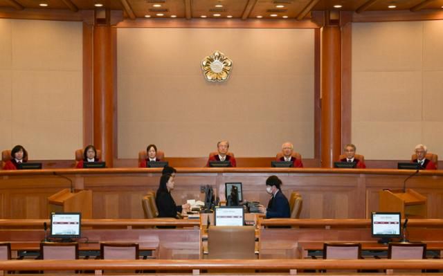 김형두(가운데) 헌법재판소장 권한대행 등 헌법재판관들이 20일 서울 종로구 헌법재판소에서 열린 손준성 검사장의 탄핵심판 2차 변론기일에 앞서 대심판정에 앉아있다. 강예진 기자 |