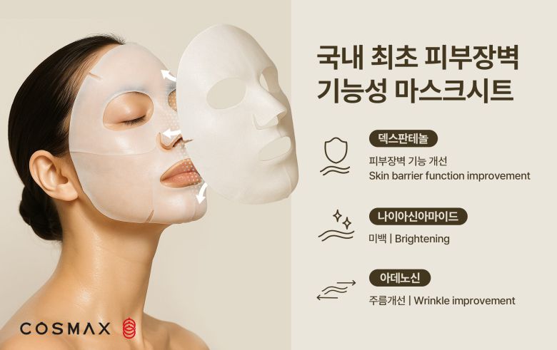 코스맥스가 신규 개발한 제품은 주름 개선, 미백 효능에 피부장벽 회복 기능까지 더한 복합 기능성 마스크시트다. 시트형 화장품이 피부장벽 관련 기능성을 인정받은 것은 국내에서 처음이다.