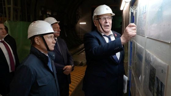 블라디미르 푸틴 러시아 대통령이 21일 러시아 쿠르스크 지역에서 건설 중인 쿠르스크 2호 원자력 발전소를 방문하고 있다. 로이터=연합뉴스 |