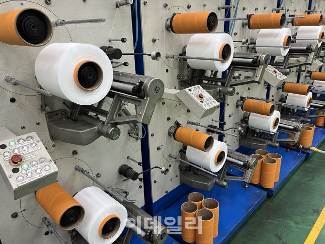 [사진 설명] 휴비스 전주공장에서 생산 중인 듀라론-쿨 냉감 원사(사진=휴비스 제공) |
