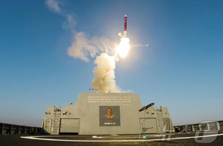 (평양 노동신문=뉴스1) = 북한의 신형 5000톤급 구축함 '최현'호에서 순항미사일이 발사되는 모습. [국내에서만 사용가능. 재배포 금지. DB 금지. For Use Only in the Republic of Korea. Redistribution Prohibited] rodongphoto@news1.kr |