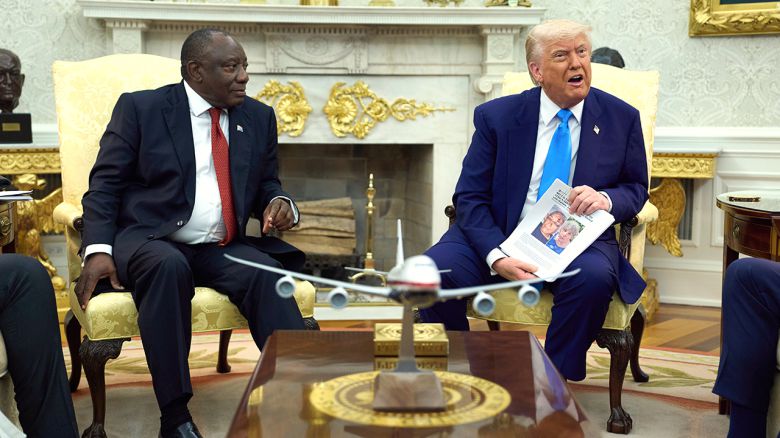 ▲ 도널드 트럼프 대통령이 21일 워싱턴 백악관 집무실에서 남아프리카공화국의 시릴 라마포사 대통령을 만나고 있다.