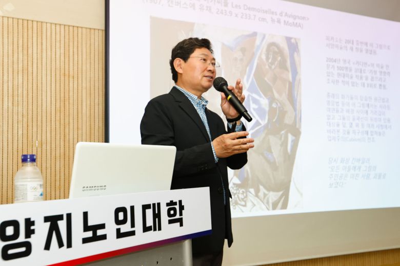 이상일 용인특례시장이 21일 양지노인대학에서 피카소의 작품 "아비뇽의 아가씨들"을 배경으로 미술 작품에 대한 강연을 하고 있다.