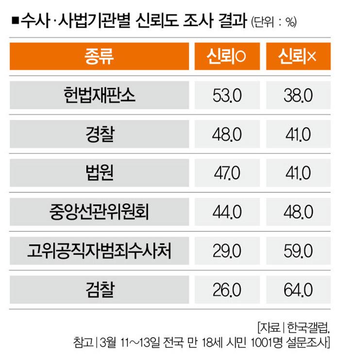 이런 검찰의 비상식적인 행태를 과연 그대로 둬도 괜찮을까. 그렇지 않다. 최근 한국갤럽이 헌법재판소ㆍ경찰ㆍ법원ㆍ중앙선관위원회ㆍ고위공직자범죄수사처ㆍ검찰 등 6개 수사ㆍ사법기관의 신뢰도를 조사해보니 검찰 신뢰도가 26.0%로 가장 낮게 나온 건 우연이 아니다. 그만큼 고강도 개혁이 필요하다는 얘기다.