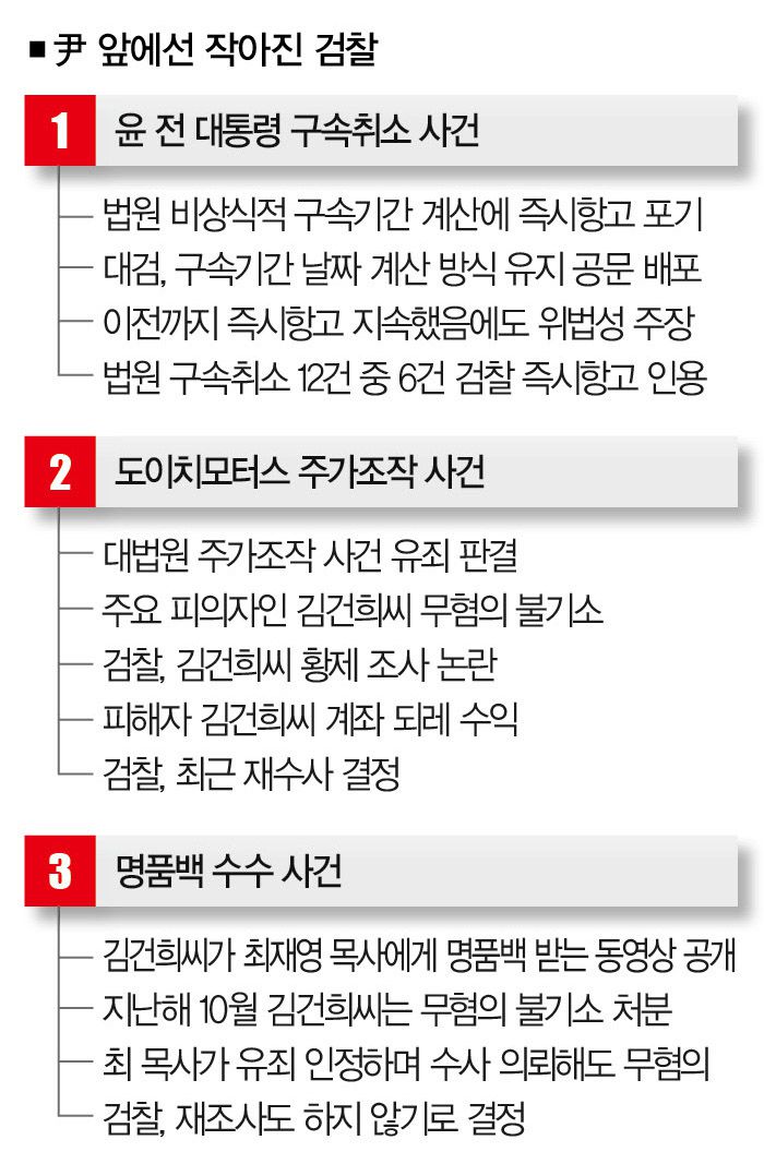 일부에선 "검찰 내부에서 서로 다른 정치적 입장이 충돌하면서 사안마다 다른 결정이 나온 것 아니냐"는 분석도 나온다. 아직 윤 전 대통령을 옹호하는 이들의 목소리도 반영되고 있을 가능성이 있다는 얘기다.