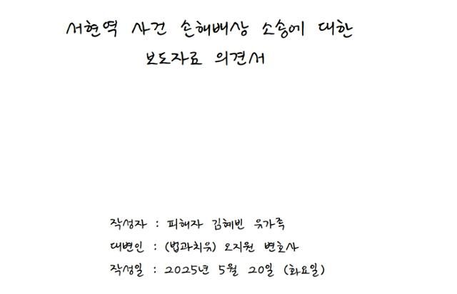 분당 서현역 흉기 난동 사건으로 숨진 김혜빈씨 유족이 범인 최원종과 그의 부모를 상대로 손해배상청구소송을 제기하면서 취재진에게 보낸 의견서 첫 페이지. 피해자 유족 제공