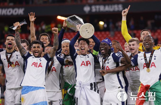[빌바오 로이터=뉴스핌] 손지호 인턴기자 = 토트넘 홋스퍼(잉글랜드)의 손흥민이 유로파리그 결승에서 우승한 후 팀 동료들과 함께 트로피를 들어 올리고 있다. 손흥민(중앙)과 크리스티안 로메로(왼쪽)의 목에 메달이 걸려 있지 않다. 2025.05.22 thswlgh50@newspim.com |