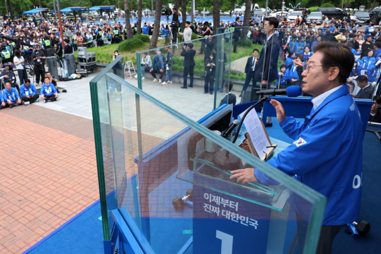 이재명 더불어민주당 대선후보가 22일 경남 양산시 양산워터파크공원에서 열린 집중유세에서 연설을 하고 있다.