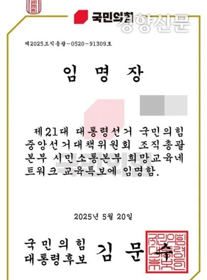 국민의힘이 전국 교사들에게 마구잡이로 김문수 후보 교육특보 임명장을 뿌렸다. 중학교 교감으로 재직 중인 지인도 지난 21일 ‘제21대 대선 국민의힘 임명장’이라는 제목의 문자 메시지를 받았다. 처음엔 스팸 문자로 생각했단다. 메시지에는 ‘OOO님 안녕하십니까, 제21대 대선 국민의힘과 함께해주셔서 감사합니다’라는 내용과 링크가 담겼다. 링크를 누르자 ‘국민의힘 대통령 후보’ 직인이 찍힌 임명장이 떴다. 발행일자는 5월20일, 임명자는 김문수 후보였다. 교사노동조합연맹 등에 따르면 9000명에 이르는 전현직 교사들에게 이런 식으로 김문수 교육특보 임명장이 발급됐다.