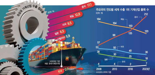 중국은 기계 산업에서 격차를 점점 벌려나가고 있다. 오승훈 기계연구원 기계정책센터장의 분석 결과 2008년 57개였던 중국의 기계 산업 수출 점유율 1위 품목은 2023년 212개로 4배 가까이 급증했다. 같은 기간 독일(184개→120개), 미국(53개→36개), 일본(38개→18개)은 중국의 추월을 허용했다. 처음에는 가격경쟁력에서 밀렸다면 어느새 기술력도 따라잡히고 말았다. 오 센터장은 “기업의 생산설비를 구성하는 기계 산업은 기술 장벽이 높을 뿐만 아니라 새로운 설비로 교체 시 발생할 수 있는 공정상 리스크 탓에 유난히 보수적”이라며 “기계 산업의 기술수명은 13~15년 정도로 추정되는데 반도체, 정보기술(IT) 등 타 산업군과 비교하면 변화의 속도가 느리지만 설계 기반 기술이 많은 게 특징”이라고 설명했다.