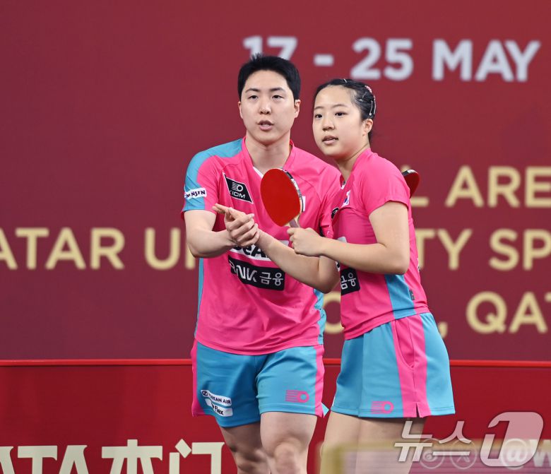 임종훈·신유빈이 20일(현지시간) 카타르 도하 카타르대학교 스포츠 컴플렉스에서 열린 '2025 국제탁구연맹(ITTF) 세계선수권대회' 혼합복식 16강전 폴란드 사무엘 쿨치츠키·주잔나 비엘고스와의 경기에서 승리를 거둔 뒤 기뻐하고 있다. 2025.5.20/뉴스1 ⓒ News1 사진공동취재단