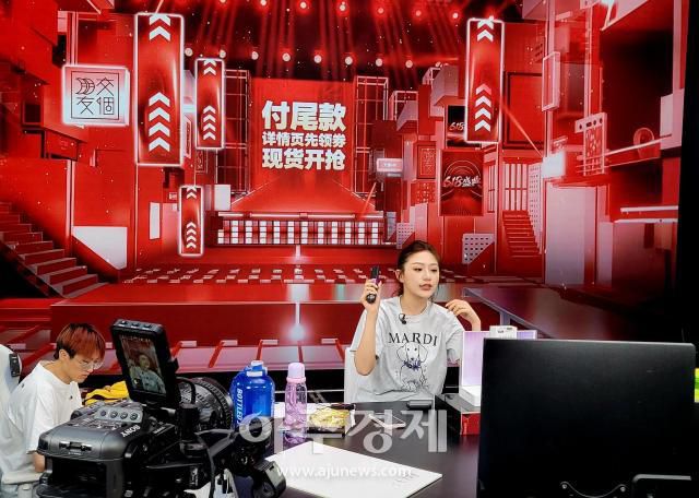 지난 21일 오후 취재진이 방문한 중국 저장성 항저우시 빈장신구에 위치한 현지 다중채널네트워크(MCN) 기업 '자오거펑유(交箇朋友)'의 한 생방송 전문 스튜디오. 중국 쇼핑축제 기간인 6월18일을 앞두고 쇼호스트가 라이브커머스(라이브스트리밍과 전자상거래 합성어)로 중국의 한 유명 브랜드 제품을 한창 홍보 중이다.