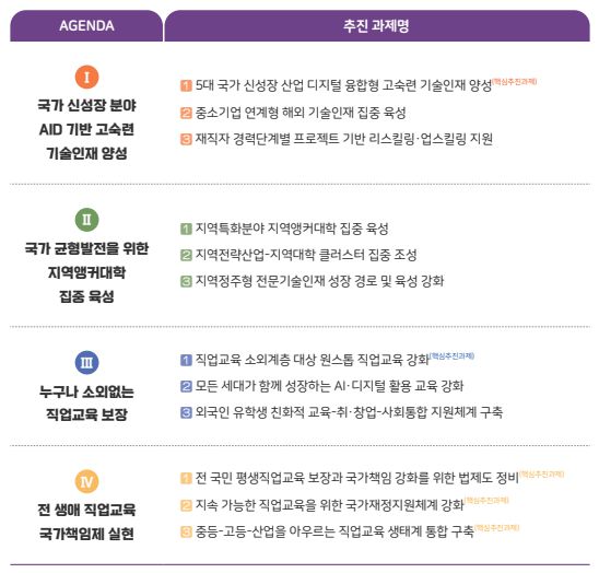 첫 번째 아젠다는 “국가 신성장 분야 AID 기반 고숙련 기술인재 양성”으로, 신산업 분야의 급속한 확산과 디지털 전환에 선제적으로 대응하기 위해, 반도체, AI, 미래 모빌리티 등 첨단 분야에서 현장 적응력과 융합역량을 갖춘 고숙련 기술인재를 전문대학 중심으로 체계적으로 양성해 줄 것을 요청했다.