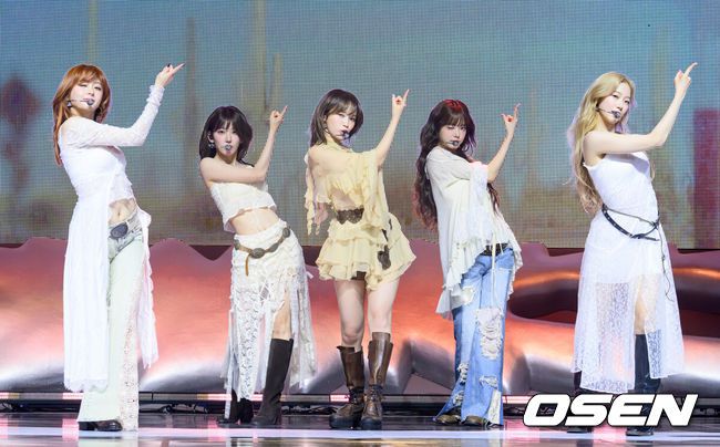[OSEN=이대선 기자] 14일 서울 광진구 예스24 라이브홀에서 그룹르세라핌(LE SSERAFIM) 미니 5집 ‘HOT’ 미디어 쇼케이스가 열렸다.르세라핌(김채원, 사쿠라, 허윤진, 카즈하, 홍은채)의 신보 ‘HOT’은 사랑하는 것에 온 마음을 다하는 태도를 담은 앨범이다.르세라핌이 신곡 무대를 선보이고 있다. 2025.03.14 /sunday@osen.co.kr