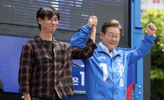 이재명 더불어민주당 대선 후보가 22일 오전 제주시 동문로터리에서 배우 박혁권 씨와 함께 유세하고 있다. 김성룡 기자 |