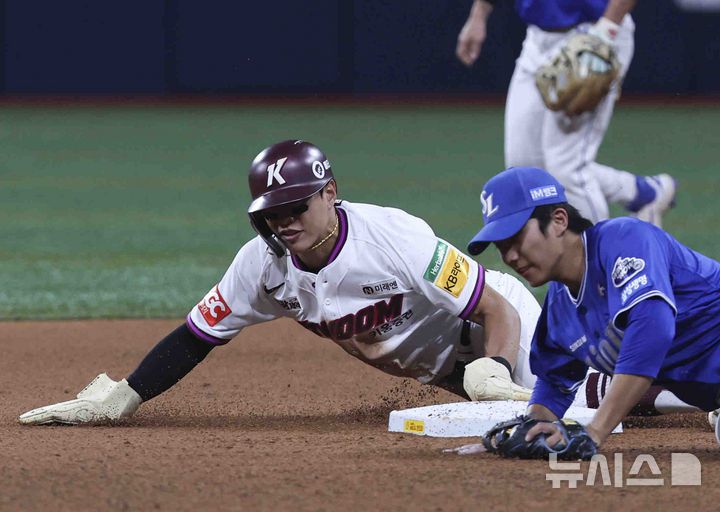 [서울=뉴시스] 김근수 기자 = 22일 서울 구로구 고척스카이돔에서 열린 2025 KBO리그 삼성 라이온즈와 키움 히어로즈의 경기, 6회말 2사 주자 1루 상황에서 1루 주자 키움 송성문이 도루를 성공하고 있다. 이날 키움 송성문은 KBO리그 역대 최다 연속 도루 성공 타이기록 29개를 기록했다. 2025.05.22. ks@newsis.com