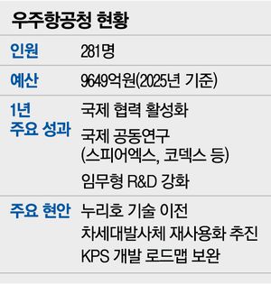 우주청은 지난해 5월 27일 한국판 미국항공우주국(NASA)을 표방하며 출범했다. 한국항공우주연구원과 한국천문연구원을 산하에 두고 기존에 과학기술정보통신부 등의 부처에서 우주·항공 관련 업무를 이관받았다. 한국형 발사체 누리호 고도화 사업, 한국형위성항법시스템(KPS), 한국 첫 달 궤도선 ‘다누리’ 운영, 달 탐사선 개발 등을 넘겨받았다.