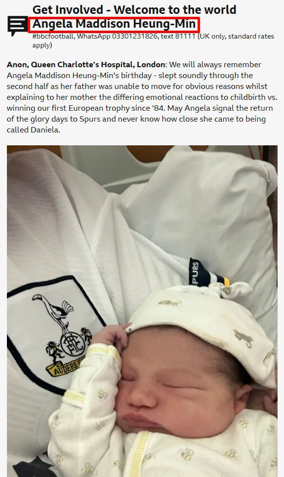 영국 공영방송 'BBC'는 "세상에 온 걸 환영합니다. 안젤라 매디슨 흥민. 우리는 안젤라 매디슨 흥민의 생일을 영원히 기억할 것"이라며 "그녀의 아버지는 명백한 이유로 움직일 수 없었기에 후반전 내내 푹 잤고, 어머니에게 출산과 1984년 이후 첫 유럽대항전 트로피 우승에 대한 감정적 반응이 어떻게 다른지 설명했다"라고 보도했다.