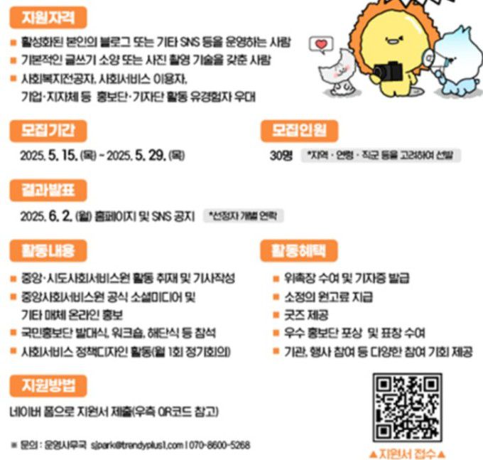 만 18세 이상 국민은 누구나 홍보단에 가입할 수 있다. 사회서비스 정책과 사회서비스원에 대한 이해와 관심이 있고 중앙·15개 시도 사회서비스원 취재가 가능하면 된다. 지역, 연령, 직군을 고려해 총 30명이 선발될 예정이다.