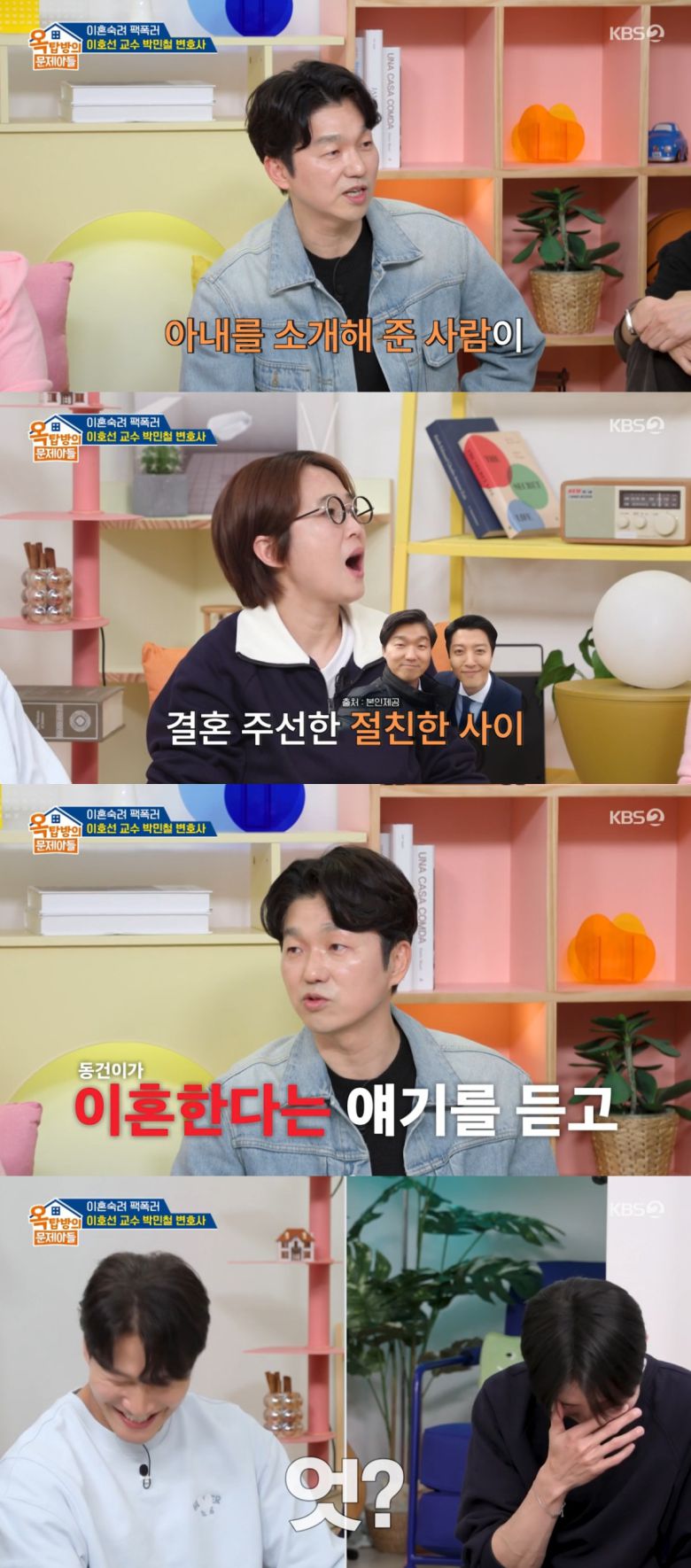 박철민은 “지금 결혼한 아내를 소개해준 사람이 이동건이다. 개인적으로 친하다. 언제 은혜를 갚지 하다가 이혼한다는 이야기를 듣고 제가...”라고 말해 분위기를 숙연하게 만들었다.