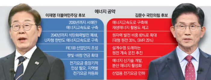 두 후보는 공통적으로 에너지고속도로 구축을 언급하면서도 어떤 발전원에 중점을 둘지에 대해서는 이견을 보였다. 이 후보는 RE100(재생에너지 100%) 산업단지를 조성하고, 햇빛·바람 연금을 확대하는 등 재생에너지를 강조했다.