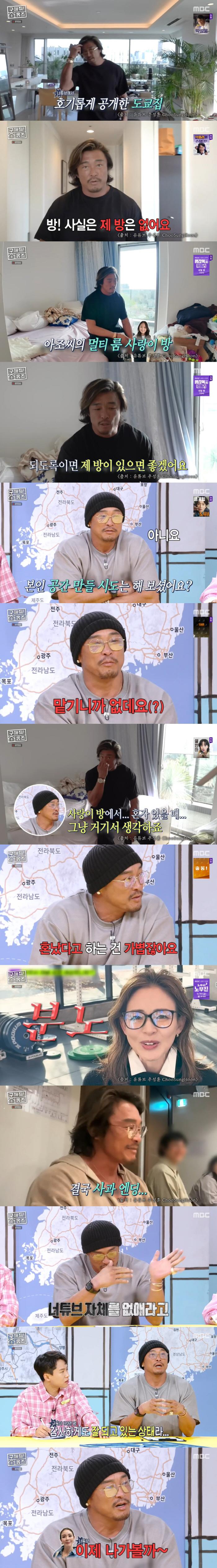 이어 추성훈은 "혼자 고민할 때는 자는 방, 사랑이 방에서 혼자 있을 때 거기서 생각한다"고 밝혔다.