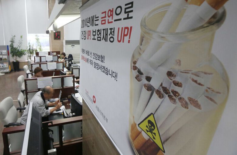국민건강보험공단이 담배회사들을 상대로 낸 손해배상 청구소송의 첫 공판이 열린 2014년 9월12일 서울 마포구 국민건강보험공단 민원실에 ‘담배소송’을 알리고 금연을 유도하는 홍보물이 걸려있다. 연합뉴스