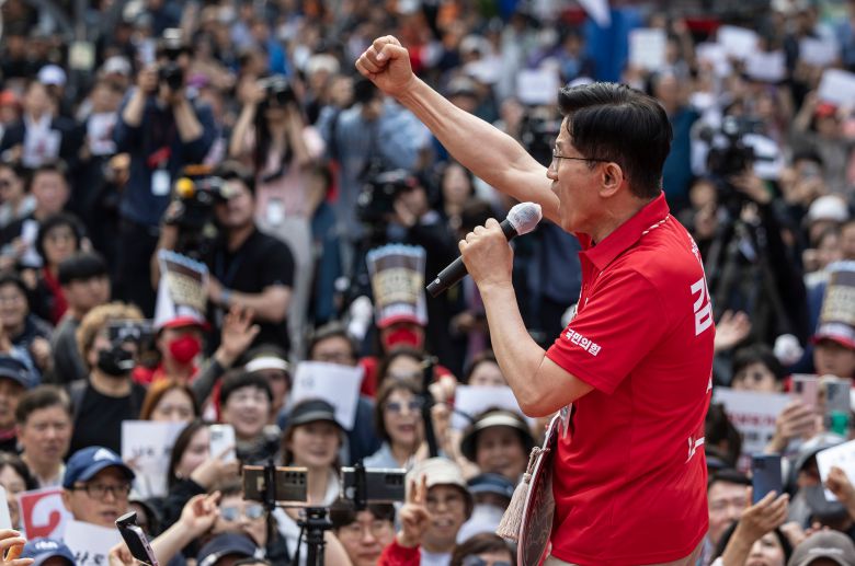 유세장 앞쪽엔 붉은 색 막대풍선 등을 들고 “김문수! 대통령!”을 외치는 60·70대 지지자들이 다수였다.