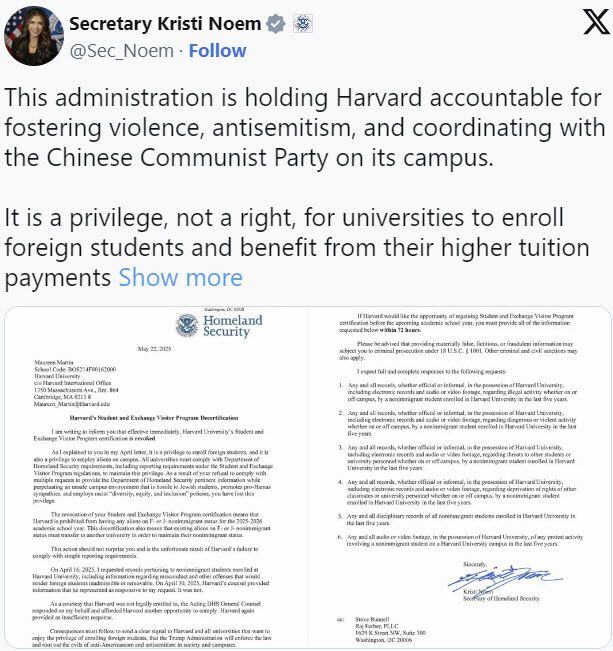 노엄 장관은 “대학이 외국인 유학생을 등록하고 이들의 높은 등록금으로 수십억 달러 규모의 기금을 운용하는 것은 권리가 아닌 특권”이라며, “하버드는 올바른 조치를 취할 기회가 충분히 있었지만 하버드는 이를 거부했다”고 주장했다.
