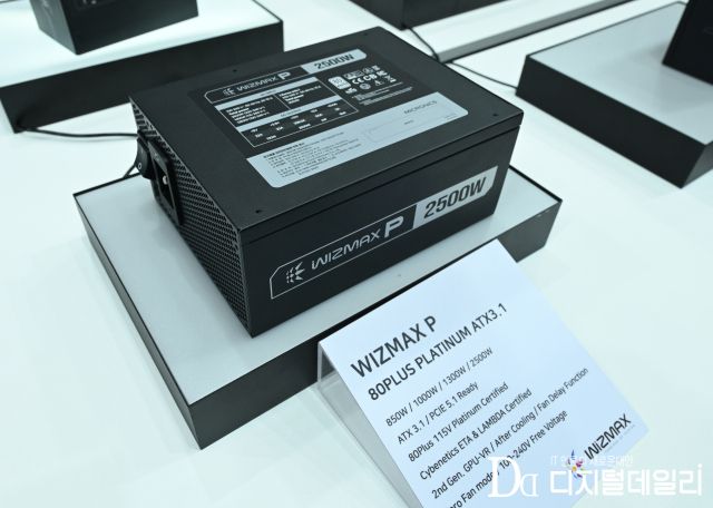 지난 8일 출시한 워크스테이션 등 고출력·고성능 컴퓨팅용 파워서플라이 '위즈맥스 P-2500W' 실물도 볼 수 있다. 이 제품은 4개의 PCIe 5.1(12V-2x6) 커넥터를 기본 제공하는 풀모듈러로 설계돼 최대 4개의 고성능 GPU를 안정적으로 지원한다. LLC 공진형 토폴로지와 듀얼 트랜스포머 기반 풀브릿지 회로, 2세대 GPU-VR 기술을 통해 100% 부하 환경에서도 +12V 전압을 정밀하게 유지할 수 있다.