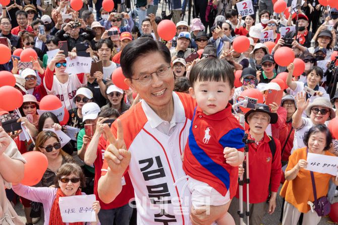 [이데일리 방인권 기자] 김문수 국민의힘 대선 후보가 21일 오후 경기 김포시 사우문화체육광장에서 열린 “더 편하게 더 빠르게” 김포 유세 현장에서 한 아이에게 꽃다발을 전달받은 뒤, 기념촬영을 하고 있다. |