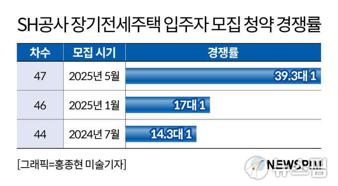23일 SH공사에 따르면 지난 21일 마감된 제47차 장기전세주택 입주자 모집공고 접수 결과 최종 청약 경쟁률은 39.3대 1로 집계됐다. 직전 차수(제46차·17대 1)보다 경쟁률이 상승했다. 약 1년 전인 지난해 7월(제44차·14.3대 1)과 비교해도 더 많은 지원자가 몰렸다.