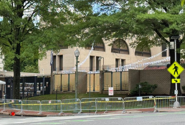 22일 미국 워싱턴 DC 북서부에 있는 주미 이스라엘 대사관 주변에 철제 펜스와 폴리스 라인이 설치돼 있다. /워싱턴=김은중 특파원
