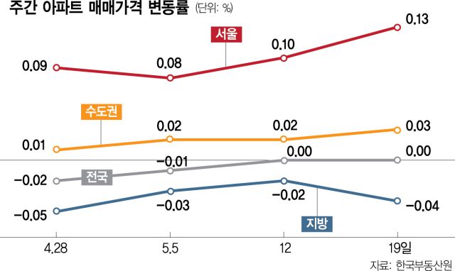 22일 한국부동산원의 5월 셋째 주(19일 기준) 주간 아파트 가격 동향 조사 결과에 따르면 서울은 0.13% 올라 16주째 상승세를 이어갔다. 상승 폭은 일주일 새 0.10%에서 0.13%로 뛰었다.