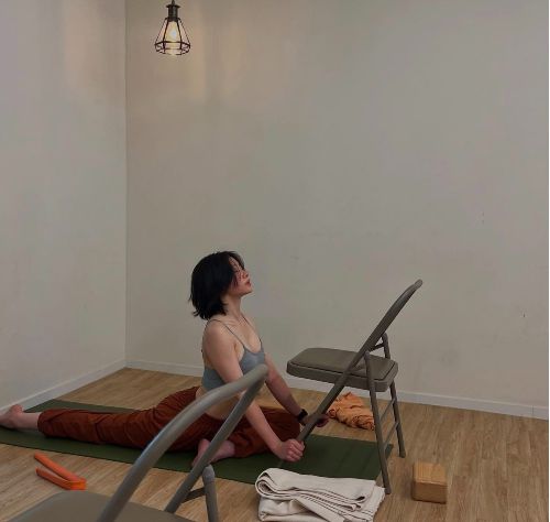 사진 속 하니는 요가 매트 위에서 체어를 활용한 아사나 자세를 수행 중이며, 고요한 공간 속에서 내면의 평온을 찾는 듯한 모습이 인상적이었다.