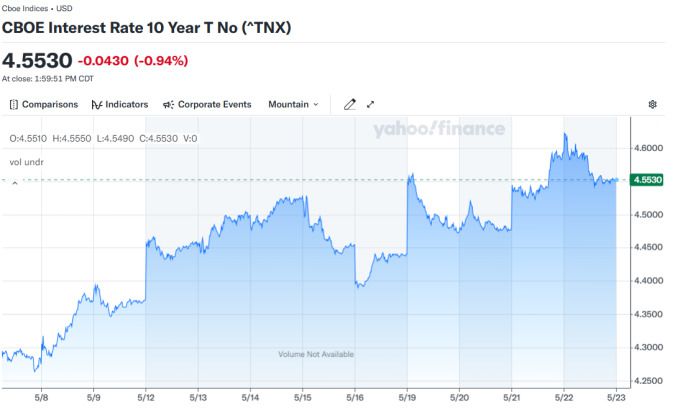 미 국채 10년물 수익률 차트, 자료=야후 파이낸스, 2025.05.23 koinwon@newspim.com |
