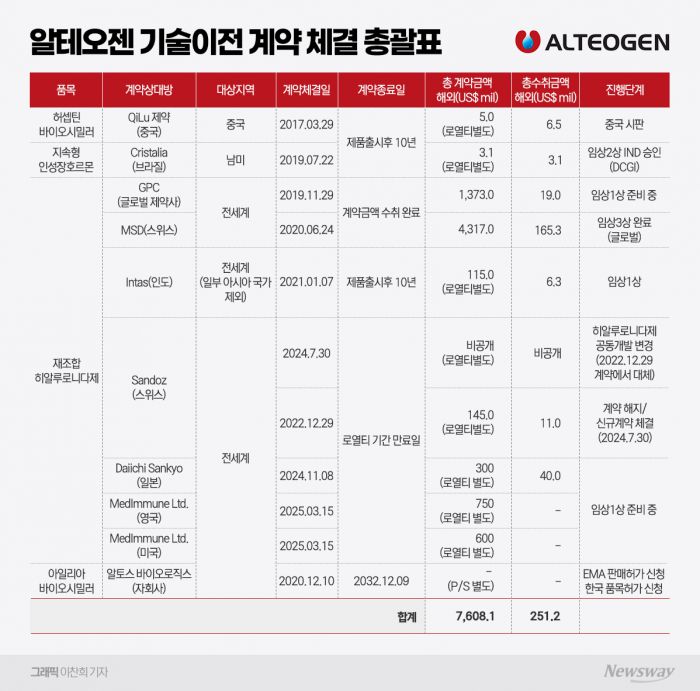 ALT-B4는 신약 후보물질이 아닌 플랫폼인만큼 여러 기업에 기술이전이 가능하다는 게 특징이다. 따라서 알테오젠은 ALT-B4를 바탕으로 성장을 지속해왔다. 2019년 글로벌 제약사 GPC에 처음으로 ALT-B4를 기술이전했으며, 이후 2020년 MSD, 2021년 Intas, 2022년 산도스, 2024년 산도스와 다이이찌 산쿄, 2025년 아스트라제네카 자회사 메드이뮨 미국 법인 및 영국 법인에 기술 수출 계약을 체결했다.