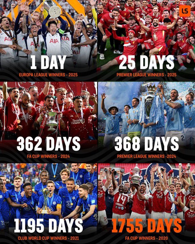 축구 통계 매체 '라이브스코어'는 'BIG 6' 클럽의 최근 우승 날짜를 나열했다. 매체에 따르면 1일 차인 토트넘을 이어 리버풀(25일), 맨유(362일), 맨시티(368일), 첼시(1195일), 아스널(1755일)이 뒤따랐다.