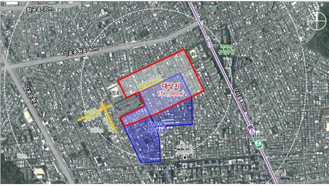 대상지는 까치산역으로부터 700m 거리에 위치한 강서구 화곡동 370-37 일대(15만6989㎡)다. 1970년대 토지구획정리사업으로 형성된 저층 다가구·다세대 주거지와 전통시장(화곡중앙시장)이 포함된 지역으로, 김포공항 주변 고도제한에 따라 대규모 개발 추진이 어려워 주거 및 보행환경 열악, 생활 인프라 부족, 시장 활력 저하 등 문제점이 많았다.