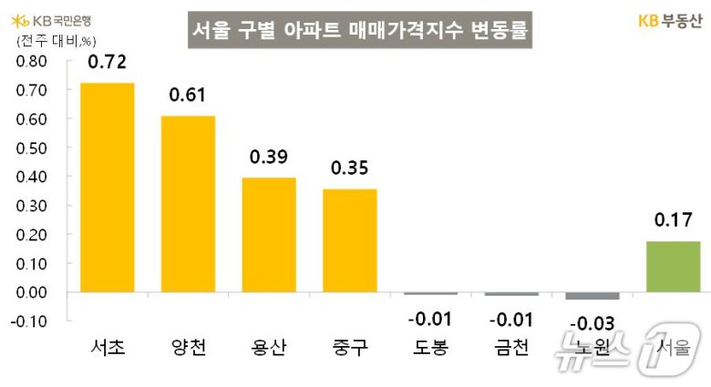 서초구 다음으로 집값 상승률이 높은 자치구는 △양천구(0.61%) △용산구(0.39%) △중구(0.35%) 순으로 집계됐다. 노원구(-0.03%), 금천구(-0.01%), 도봉구(-0.01%)는 집값이 하락했다.