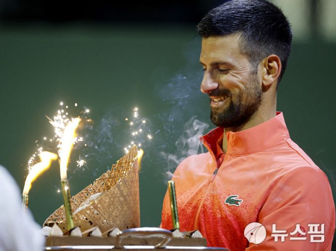 [제네바 로이터=뉴스핌] 장환수 스포츠전문기자= 노바크 조코비치가 23일 스위스 제네바오픈 단식 3회전에서 승리한 뒤 38세 생일 축하 케이크를 받고 있다. 2025.05.23 zangpabo@newspim.com |