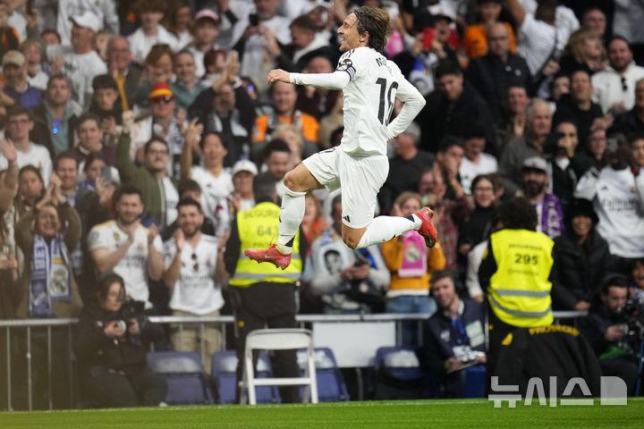 [마드리드=AP/뉴시스] 레알 마드리드의 루카 모드리치가 지난 2월23일(현지 시간) 스페인 마드리드의 산티아고 베르나베우 스타디움에서 열린 2024-25 라리가 25라운드 지로나와 경기 전반 41분 선제골을 넣고 세리머니하고 있다. 올해 40세인 모드리치는 이날 선발로 나서 원더골을 넣어 노익장을 과시하며 팀의 2-0 승리를 이끌었다. 2025.02.24. |