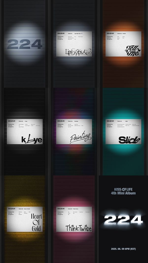 KISS OF LIFE는 23일 0시, 공식 SNS 채널을 통해 오는 6월 9일 발매되는 미니 4집 ‘224’의 트랙리스트 영상을 공개했다. 영상에는 감각적인 로파이 사운드와 함께 돌아가는 레일 위로 수록곡명이 적힌 박스들이 하나씩 등장, 감성을 자극하는 연출로 팬들의 기대감을 한껏 높였다.