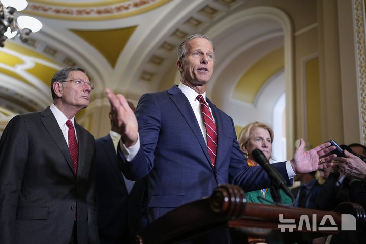 [워싱턴=AP/뉴시스] 미국 상원 공화당 1인자인 존 튠(사우스다코타) 원내대표는 22일(현지 시간) 블라디미르 푸틴 러시아 대통령이 진정성 있는 즉각적인 휴전안을 제시하지 않으면 새로운 제재에 직면하게 될 것이라고 경고했다. 사진은 튠 원내대표가 지난달 1일 워싱턴 국회의사당에서 도널드 트럼프 미국 대통령의 관세 관련 발표를 앞두고 기자들과 이야기하는 모습. 2025.05.23.