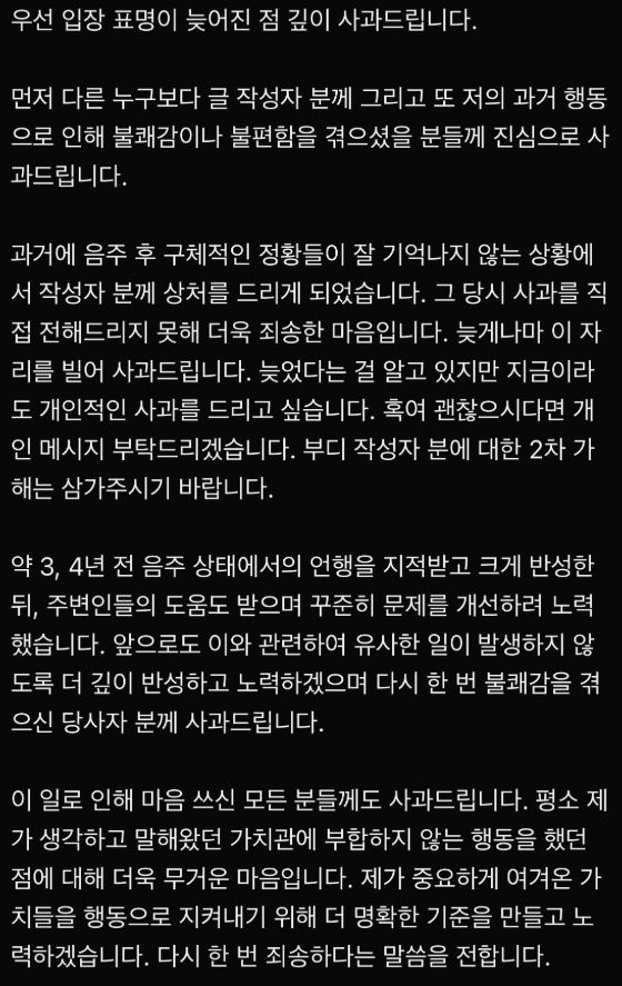 나상현은 오늘(23일) SNS에 "입장 표명이 늦어진 점 깊이 사과드립니다"라면서 "과거 음주 후 구체적인 정황들이 잘 기억나지 않은 상황에서 피해자에게 상처를 드리게 됐다"라고 사과 글을 올렸습니다.