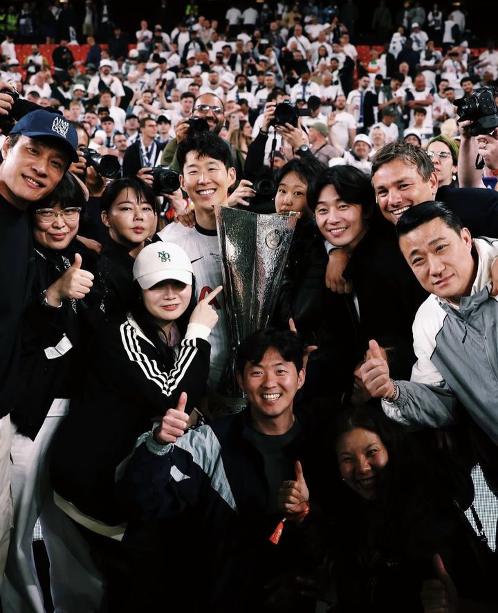 [서울=뉴시스] 토트넘 홋스퍼의 손흥민이 지난 21일(현지 시간) 스페인 빌바오의 산 마메스 스타디움에서 열린 2024-25 유럽축구연맹(UEFA) 유로파리그(UEL)에서 우승한 뒤 배우 박서준(오른쪽 세번째) 등 지인들과 기념촬영 하고 있다. 토트넘은 결승전에서 맨체스터 유나이티드를 1-0으로 꺾고 우승을 차지했으며, 손흥민은 생애 첫 우승컵을 들어 올렸다. (사진=손흥민 인스타그램 캡쳐) 2025.05.23. photo@newsis.com *재판매 및 DB 금지
