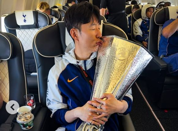 2024~25 유럽축구연맹(UEFA) 유로파리그 우승을 차지한 손흥민(33·토트넘)이 비행기에서도 우승 트로피를 꼭 껴안은 채 귀국했다.