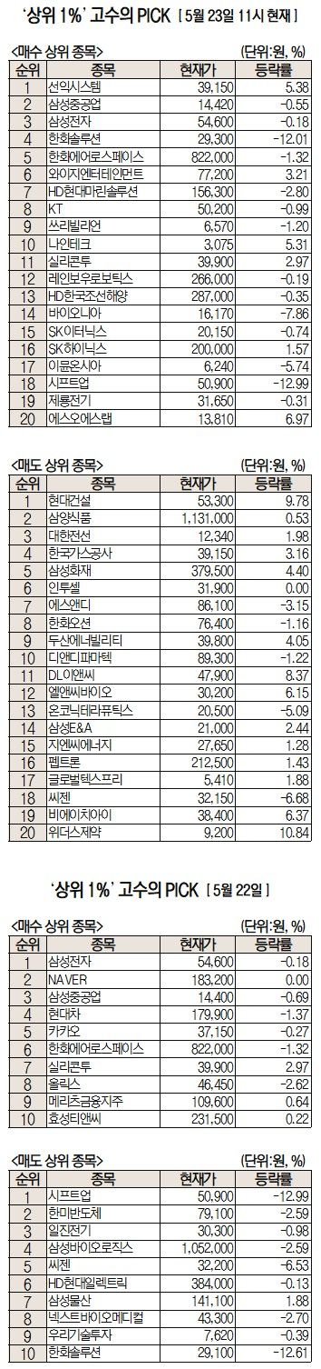 미래에셋증권에서 거래하는 고수익 투자자들이 23일 오전 가장 많이 순매수한 종목은 선익시스템(171090), 삼성중공업(010140), 삼성전자(005930) 등이다.